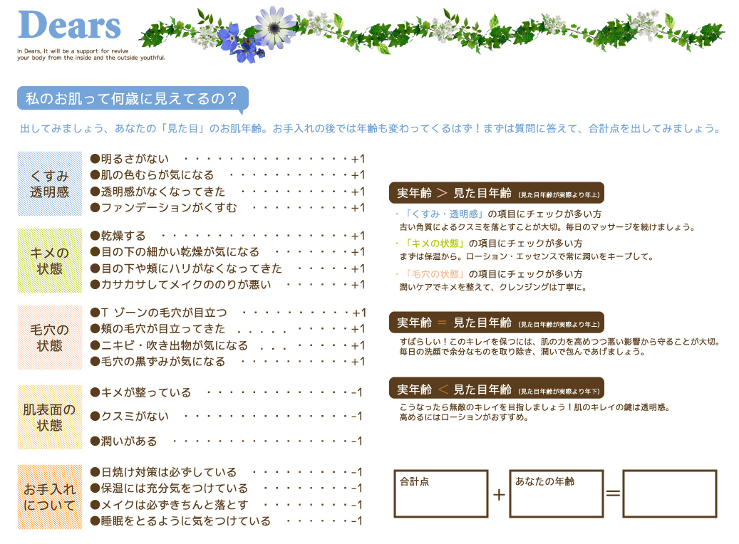 姿勢や歩き方など痛みや症状に関わらず、何でもお気軽にご相談ください。 Dearsは、一人ひとりのお客様に合わせて決め細やかな調整で、心身のバランスを整えて健康と美を手に入れるお手伝いをいたします。 一緒に健康で若々しいエイジレスな女性を目指しましょう!